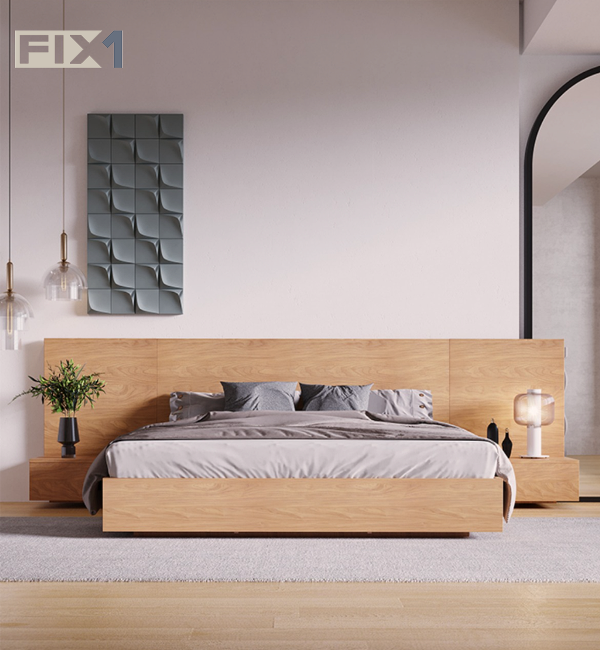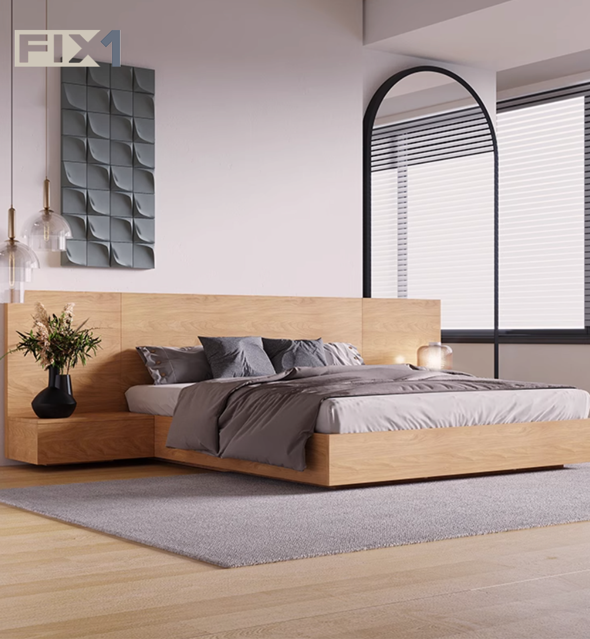 سرير مع كومدينة متصلة بتصميم عصري يجمع بين الراحة والأناقة، يوفر تناغمًا جميلًا في الغرفة ومساحة عملية لحاجاتك اليومية بجانب السرير